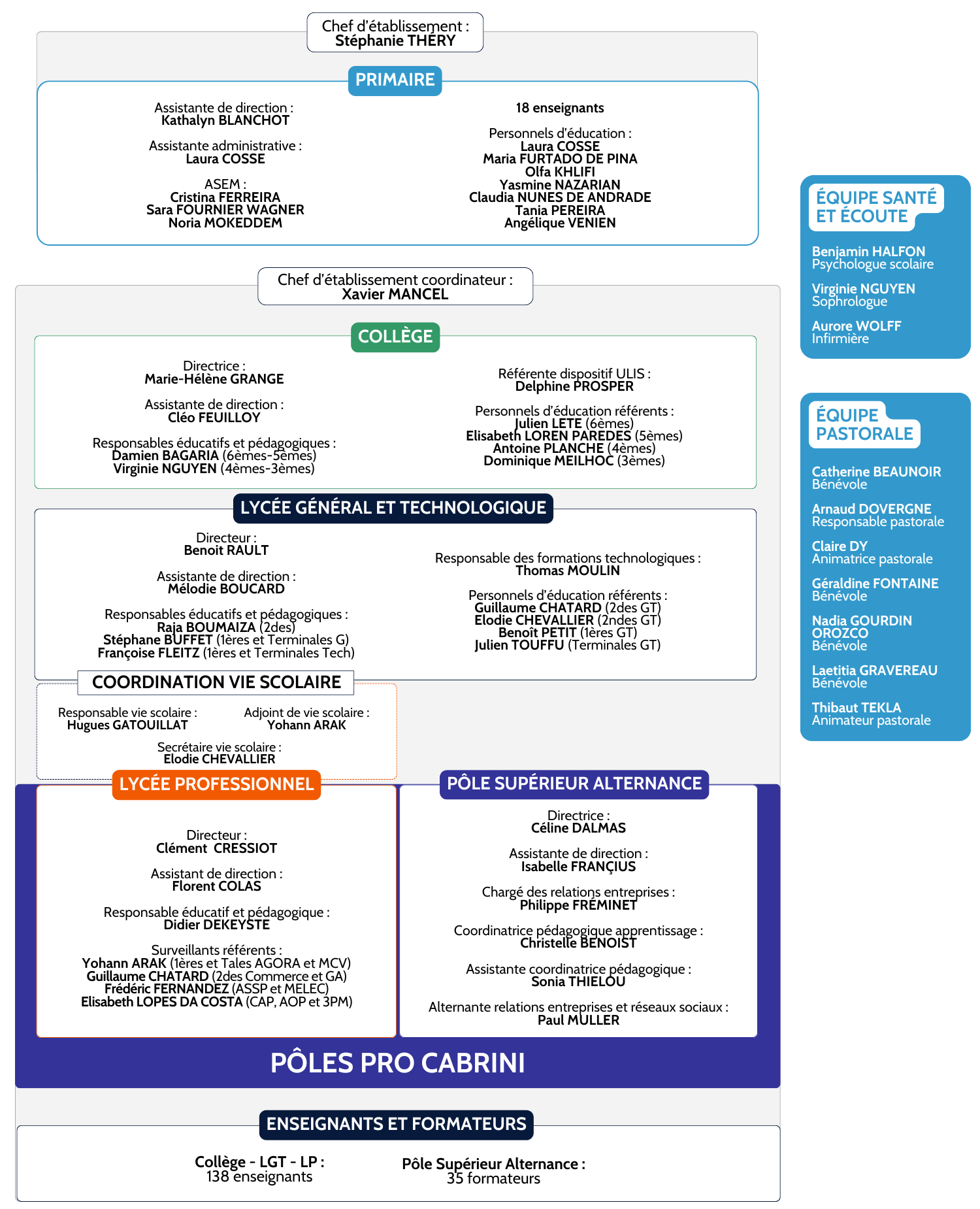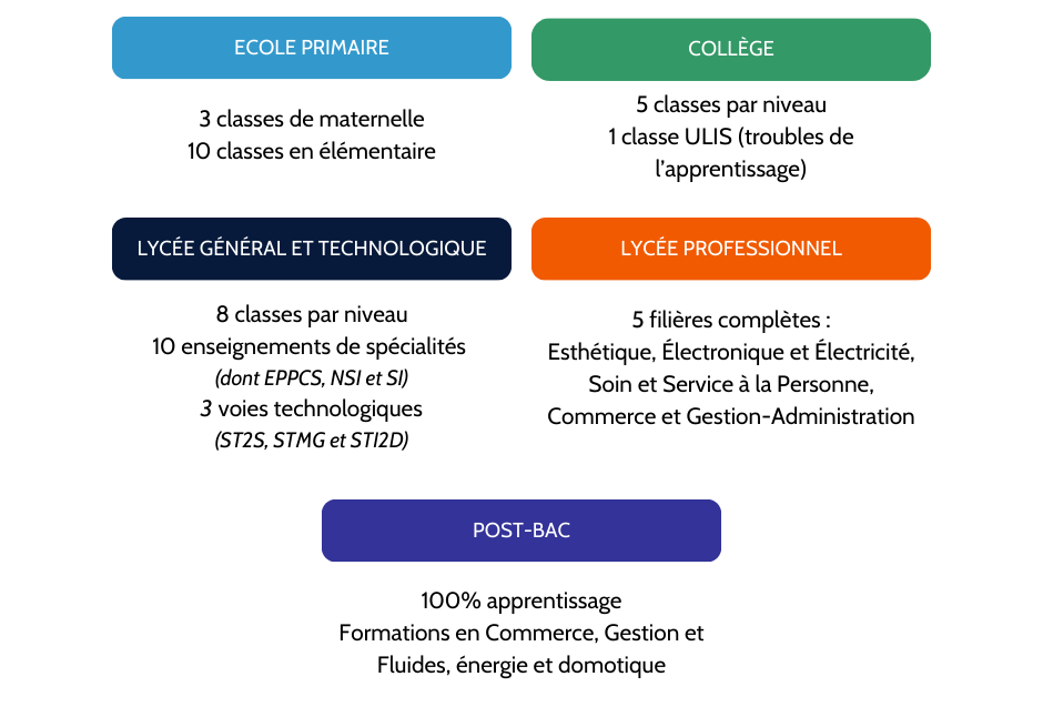 L’ensemble scolaire accueille près de 2400 élèves de la maternelle au supérieur, et 250 membres du personnel.
